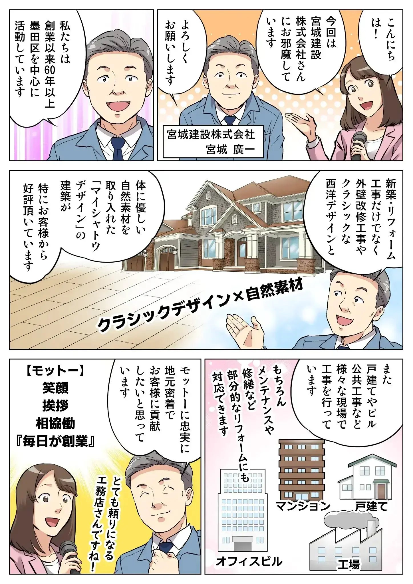 宮城建設は、東京都墨田区を拠点にその近隣区である江戸川区、足立区、葛飾区、江東区、台東区、荒川区を中心に施工を承っております。地域密着で、きめ細やかで迅速な対応を心掛けております。